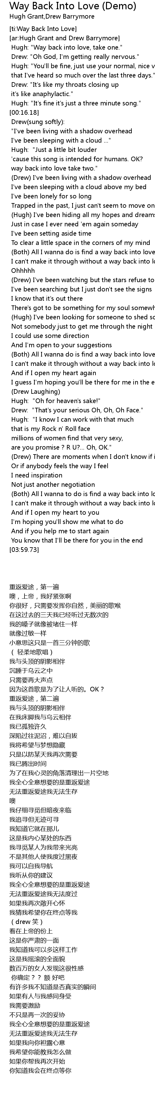 The way back into love - hugh grant and drew barrymore - Music and lyrics.. Drew Barrymore Way Back Into Love Lyrics are a theme that is being searched for and favored by netizens now. You can Get the Drew Barrymore Way Back Into Love Lyrics here. Get all royalty-free pix. Hugh Grant, Haley Bennett - Way Back Into Love (Lyrics), Hugh Grant, Haley Bennett - Way Back Into Love (Lyrics) Lyrics video for "Way Back Into Love" by Hugh Grant & Haley Bennett .